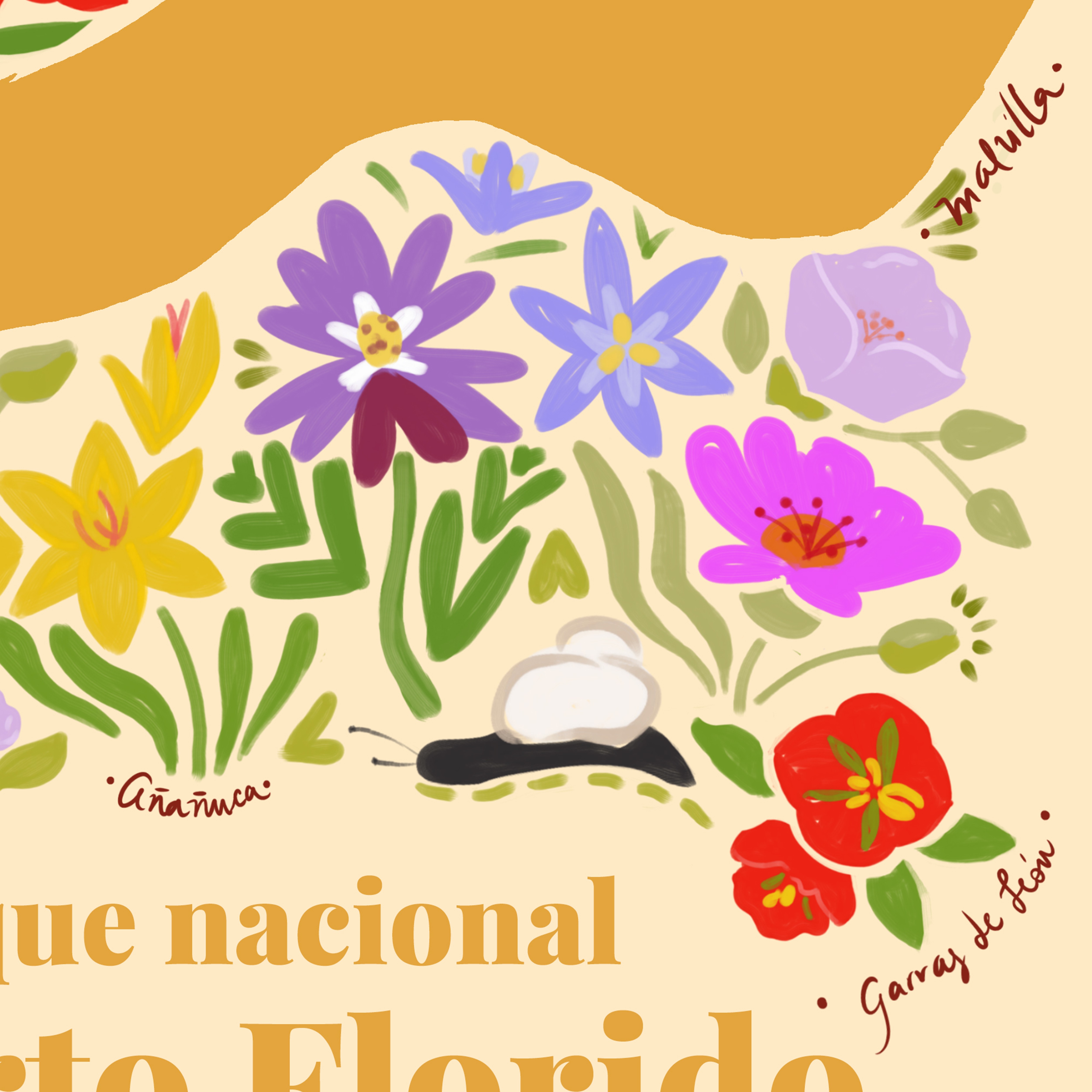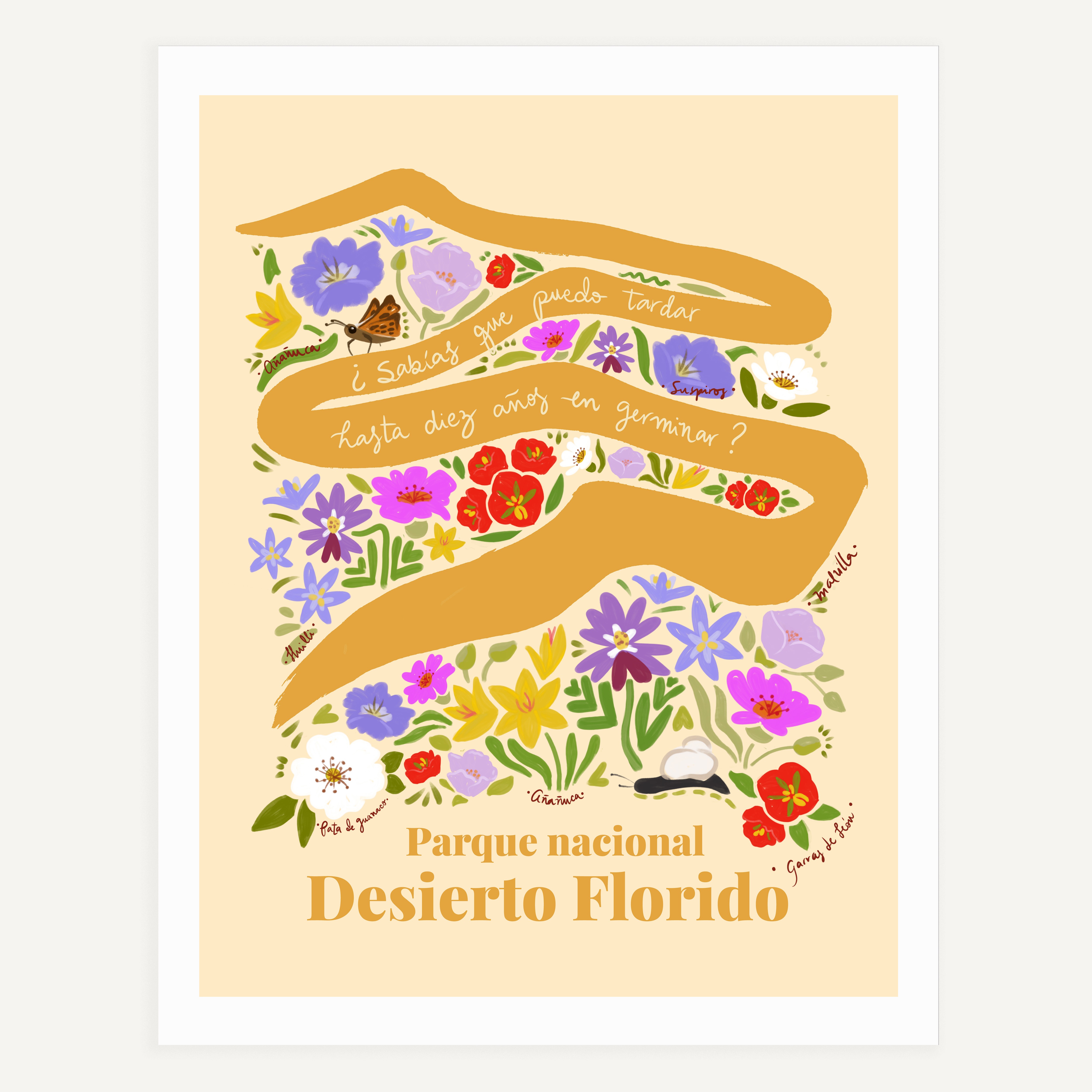 La propuesta se centra en el fenómeno del desierto florido, utilizando ilustración para representar la flora y fauna del territorio, junto a un mensaje orientado al cuidado y respeto de los senderos.