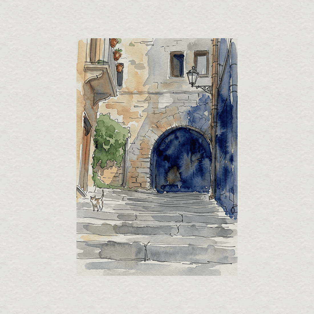 Serie de acuarelas realizados a partir de registros personales durante viajes, explorando paisaje y arquitectura desde una mirada observacional.